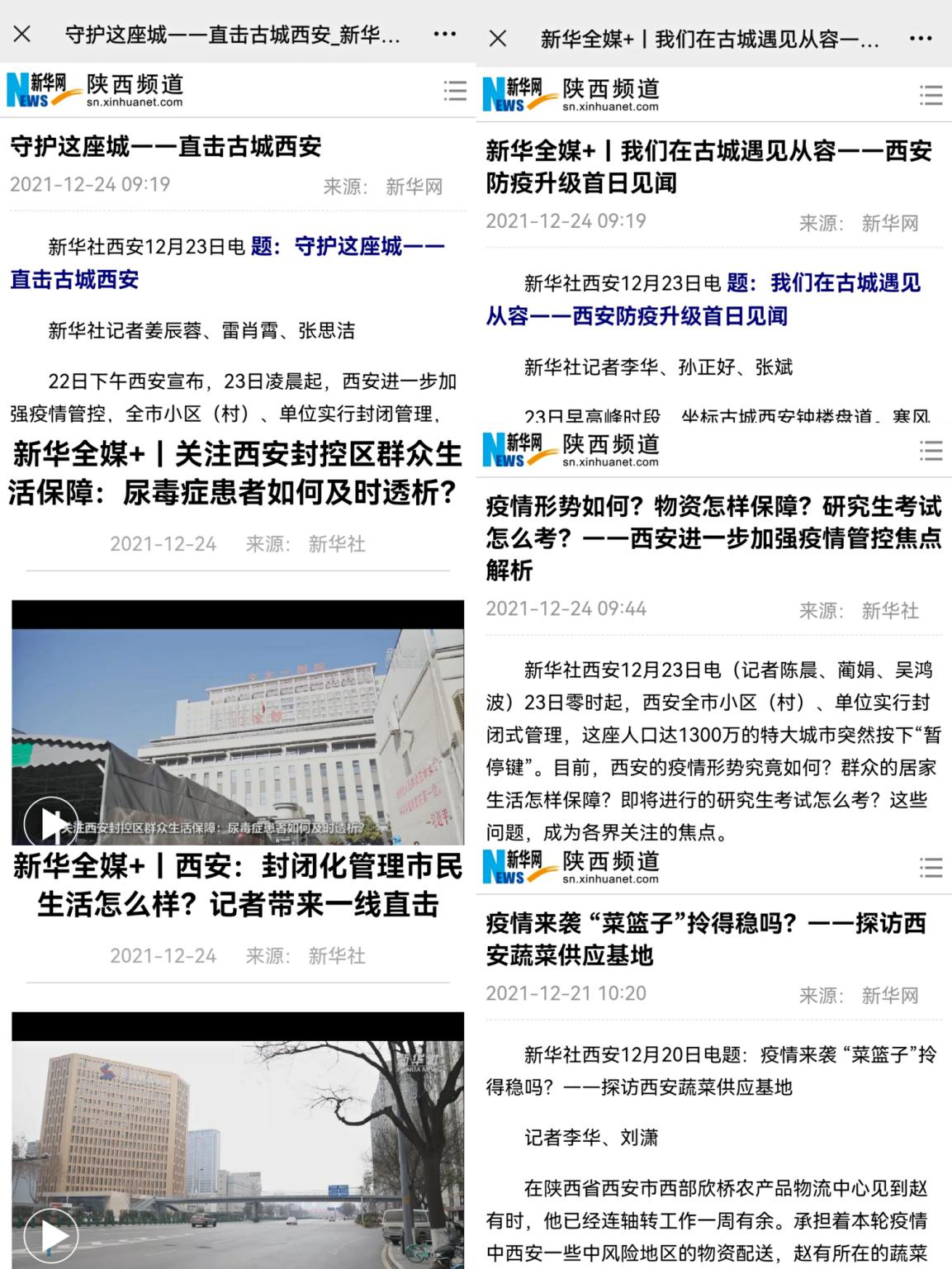 從關(guān)注尿毒癥患者如何及時透析到封閉化管理市民生活怎樣,從西安防疫升級首日見聞到記者答疑確診病例為何增長迅速,從新一輪核酸檢測現(xiàn)場到蔬菜保供打消市民恐慌……新華社記者每天從城市的各個角落發(fā)回第一手消息,用他們的筆觸、鏡頭向廣大網(wǎng)民展現(xiàn)西安城的堅守和溫暖,最大程度還原這座城市疫情防控過程中每一個環(huán)節(jié)的進展與成效。