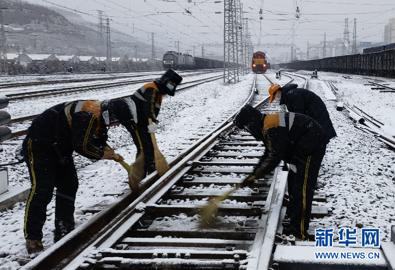 12月25日,鐵路職工正在西安至平?jīng)鲨F路彬州西站清掃道岔積雪,保證彬州煤炭外運暢通有序。張靜 攝