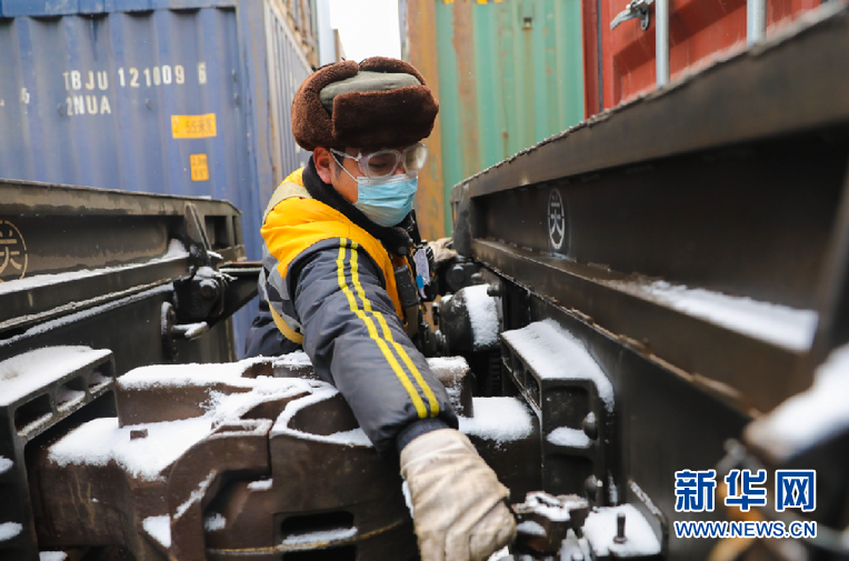 12月25日,在西安國際港站,鐵路調(diào)車作業(yè)人員正在編組中歐班列(西安)待發(fā)車輛。鐘翰林 攝
