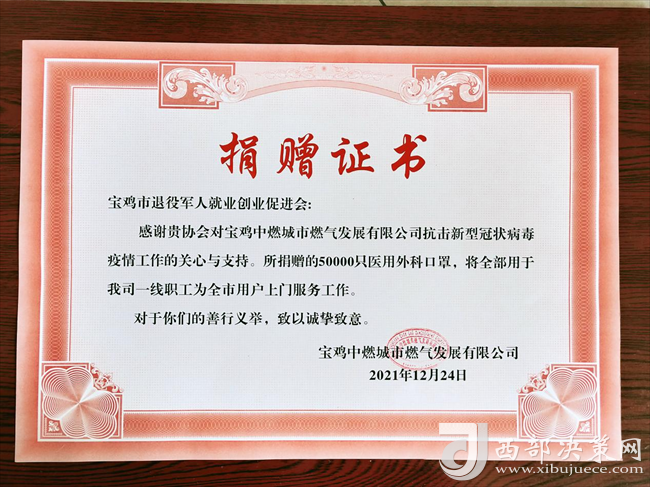 西部決策網(wǎng)訊 (任書彥)12月24日,寶雞市退役軍人就業(yè)創(chuàng)業(yè)促進會向寶雞中燃城市燃氣發(fā)展有限公司無償捐贈醫(yī)用外科口罩50000只,以全力支持寶雞市抗疫防疫工作。