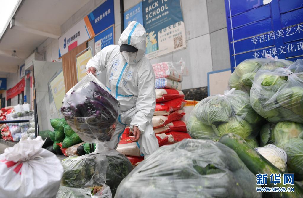 1月5日,志愿者李光在德善愛心共享廚房搬運物資。新華社記者 張博文 攝