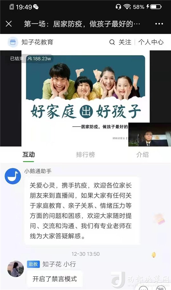 該校全體學生和學生家長按時觀看了每一場直播講座。專家提醒家長一定要在生活上多關(guān)心孩子,用心陪伴孩子,在生活中做孩子的榜樣。通過參與本次活動,大家都感覺受益匪淺,同時還拉近了親子關(guān)系,掌握了情緒調(diào)節(jié)的小技巧,引導家長和孩子們能更加積極樂觀的適應(yīng)疫情下的生活,享受美好的親子時光。