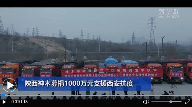 為了支援西安市疫情防控工作,陜西省神木市于1月3日發(fā)起募捐活動,全市愛心企業(yè)和愛心人士積極響應(yīng)參與,共募集善款1000萬元。神木市用部分善款采購了緊缺生活物資和防疫物資,并向陜西省慈善協(xié)會捐款361.3萬元。8日凌晨,滿載抗疫物資的11輛貨車抵達(dá)西安。