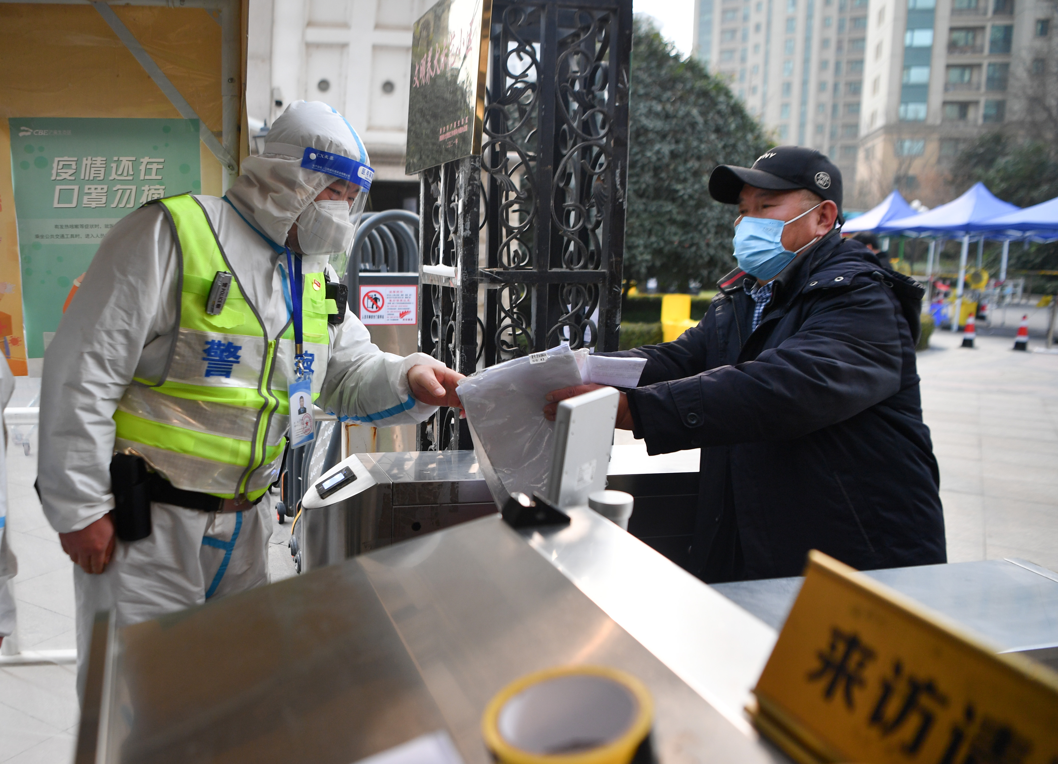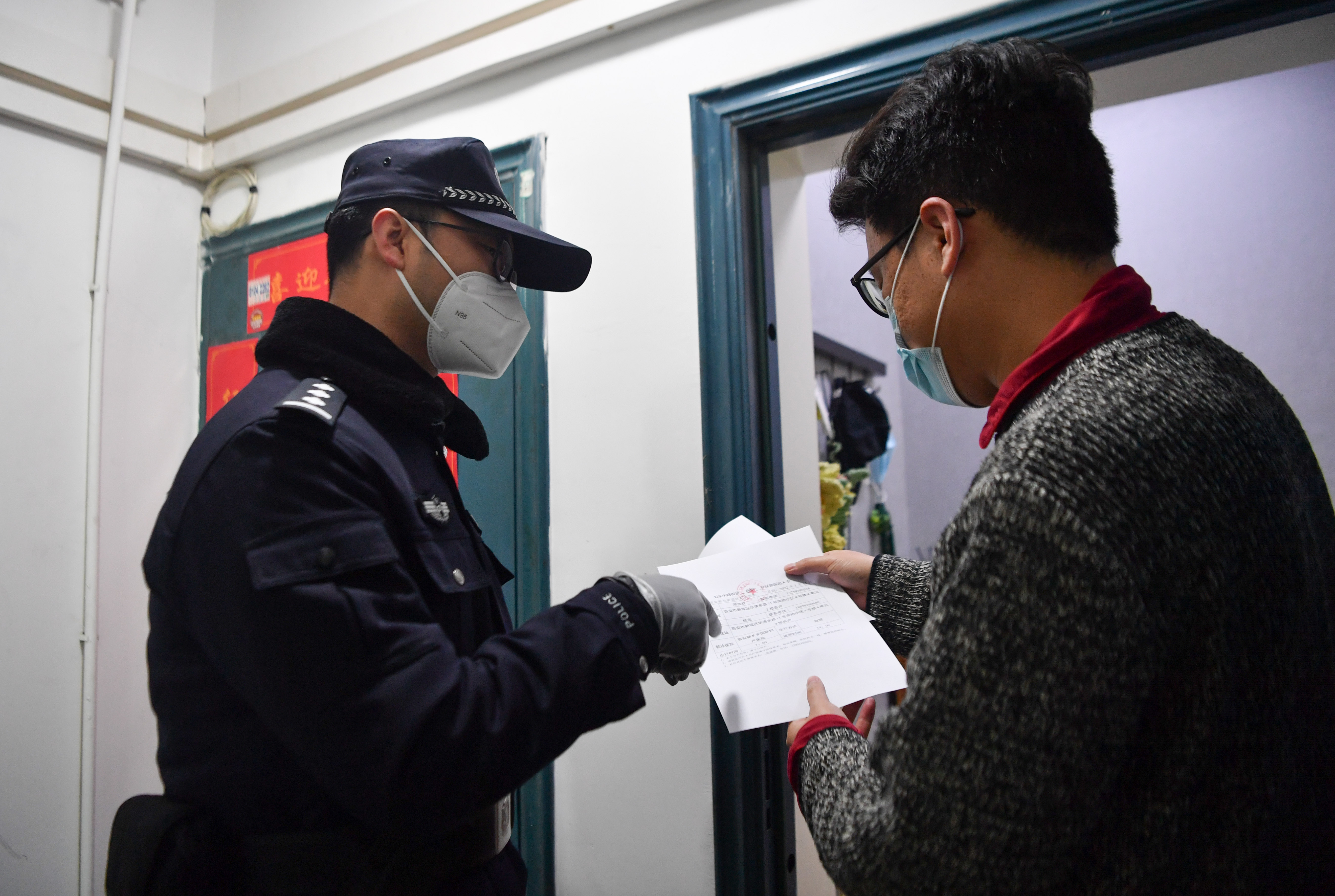 1月10日,西安市公安局浐灞生態(tài)區(qū)分局民警在負(fù)責(zé)執(zhí)勤的社區(qū)向居民講解疫情防控政策。新華社記者 張博文 攝