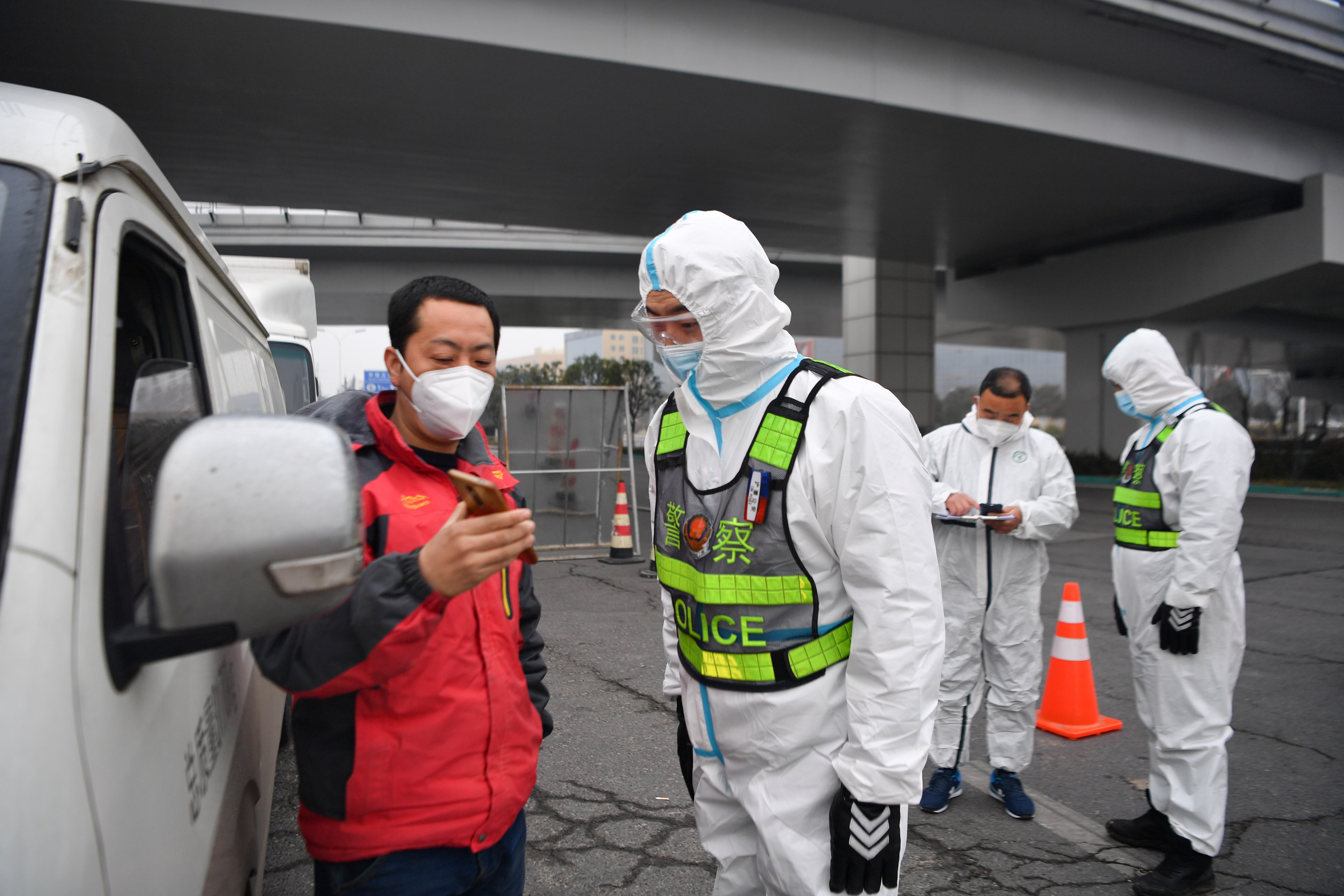 1月10日,西安市公安局浐灞生態(tài)區(qū)分局民警在西安市繞城高速新筑收費(fèi)站查驗(yàn)駕駛員健康碼。新華社記者 張博文 攝