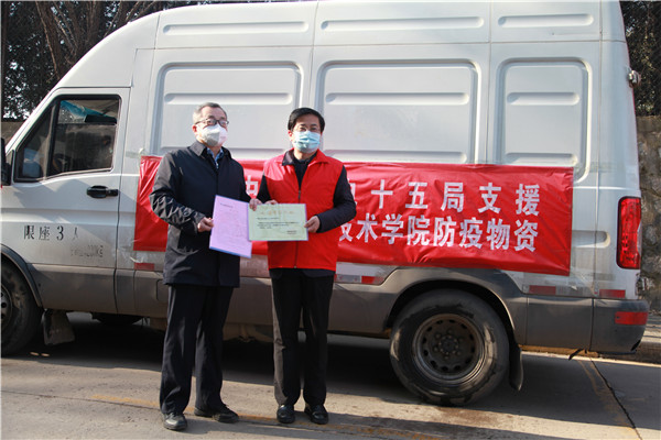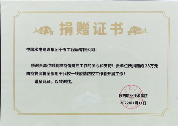 1月11日下午15:00,在陜西職業(yè)技術(shù)學(xué)院舉行簡(jiǎn)短捐贈(zèng)儀式,陜西職業(yè)技術(shù)學(xué)院黨委副書記、院長(zhǎng)劉勝輝,黨委副書記、紀(jì)委書記何軍,副院長(zhǎng)王慶等參加了捐贈(zèng)儀式。劉勝輝代表學(xué)院黨委向我公司表示感謝,他表示,在疫情防控的關(guān)鍵時(shí)刻,水電十五局一周內(nèi)2批次送來(lái)價(jià)值近28萬(wàn)元生活物資,及時(shí)緩解更極大充實(shí)和豐富了我校抗疫生活物資,為我院師生樹立了光輝榜樣,堅(jiān)定了共克時(shí)艱的信心和決心。何軍向公司黨委副書記、紀(jì)委書記、工會(huì)主席任志宏贈(zèng)送了捐款證明和感謝信。任志宏表示,水電十五局作為駐陜央企,一直以來(lái),堅(jiān)決貫徹落實(shí)黨中央決策部署,主動(dòng)響應(yīng)陜西省委組織部和省國(guó)資委號(hào)召,面對(duì)此次疫情,將積極踐行央企擔(dān)當(dāng),履行社會(huì)責(zé)任,用實(shí)際行動(dòng)為西安高校疫情防控貢獻(xiàn)一份力量!