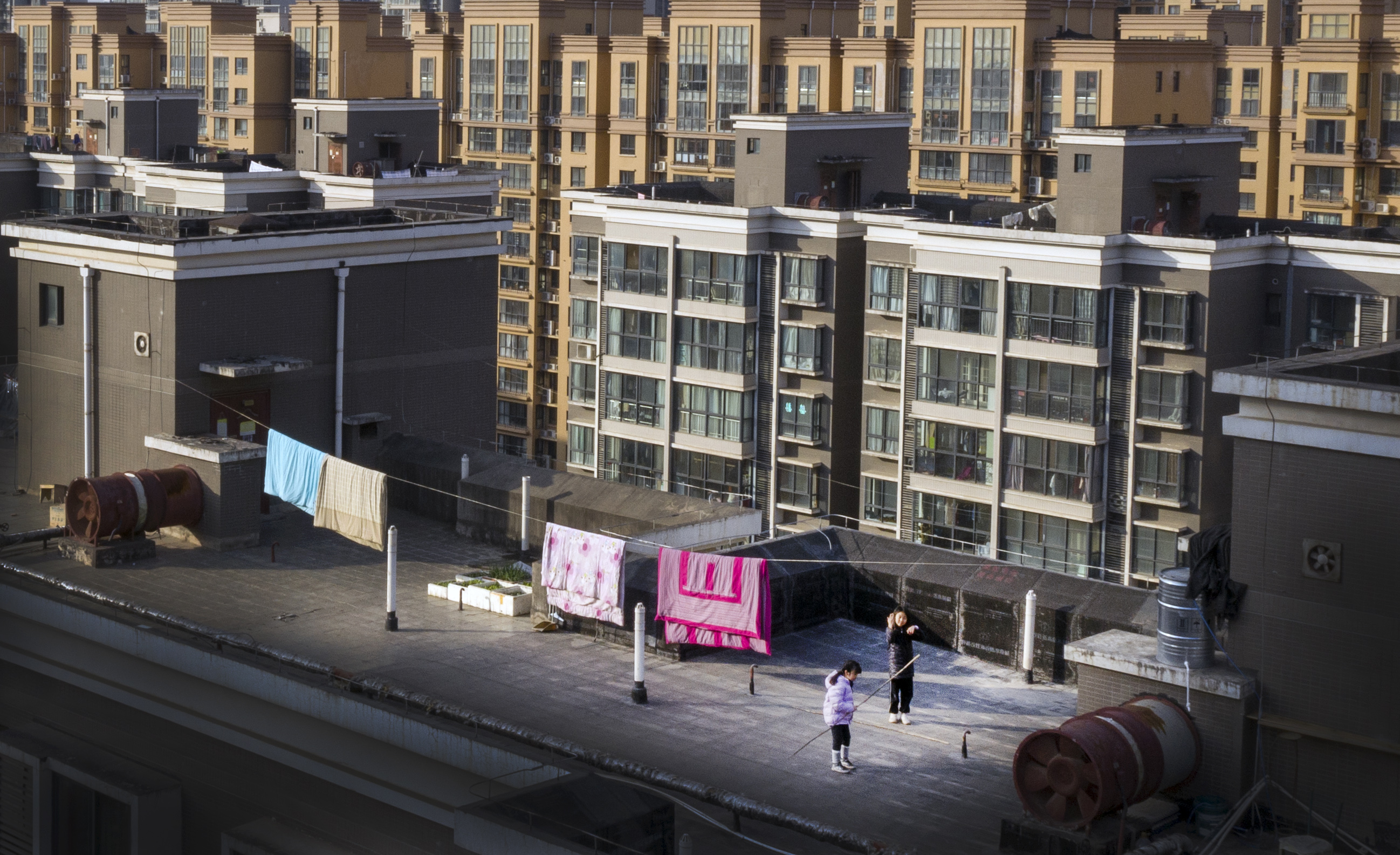 1月14日,西安市一小區(qū)居民在樓頂上打羽毛球(無人機照片)。