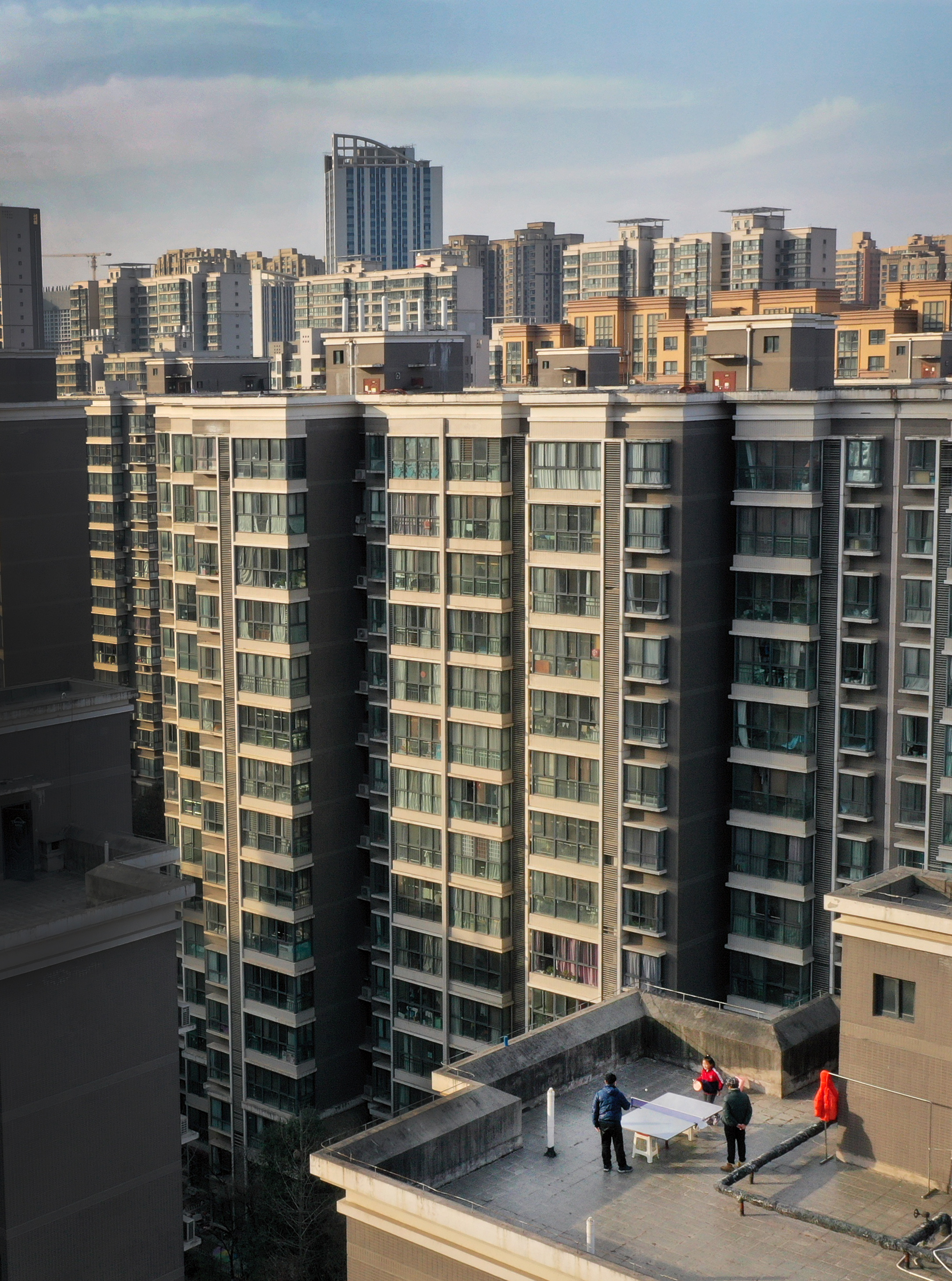 1月13日,西安市一小區(qū)居民在樓頂上打乒乓球(無人機照片)。新華社記者 陶明 攝