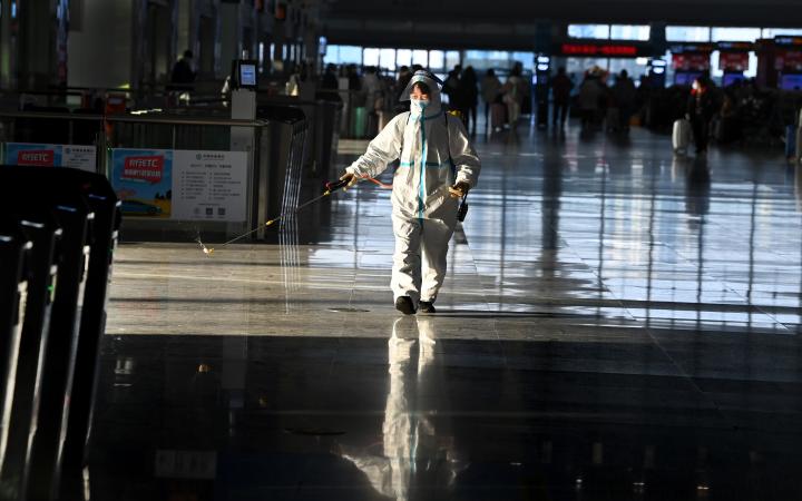 1月16日,工作人員在對(duì)西安北站候車大廳進(jìn)行環(huán)境消毒。新華社記者 陶明 攝