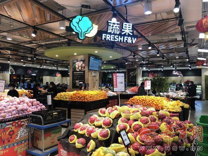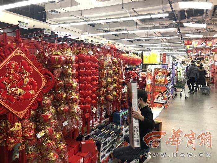 記者體驗了一下,超市嚴(yán)格落實防疫要求,顧客掃碼,憑綠碼進入。超市門口,有燈籠、“福”字等年貨。超市播著過年喜慶的音樂,貨物齊全,市民們在有序購物,工作人員正在給部分貨物加貨。
