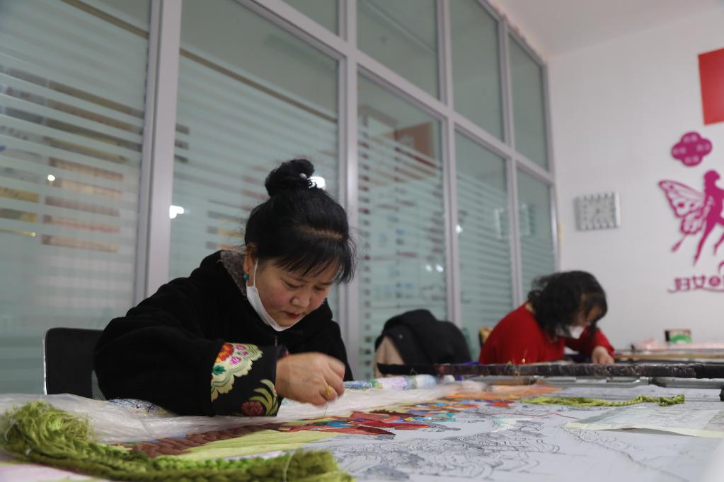 1月24日,繡娘李秀英(左一)和石玉秀(右一)在制作藏繡。新華社記者央秀達珍 攝