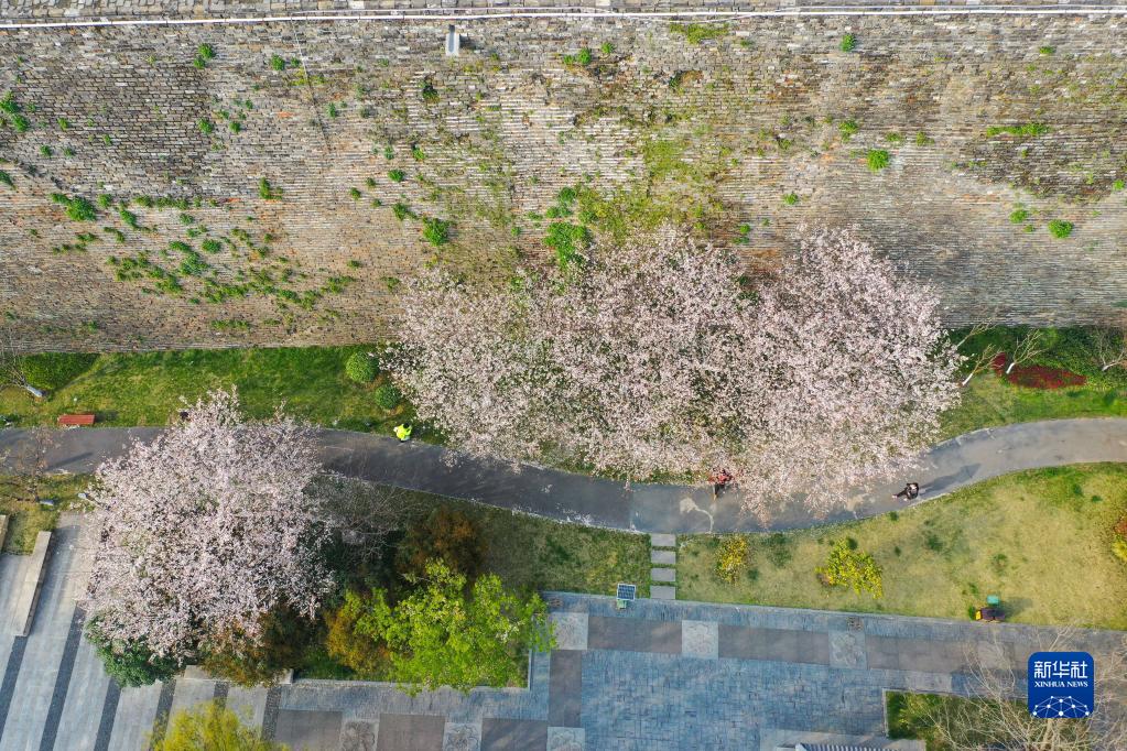 3月23日,游人在南京明城墻腳下游玩(無人機照片)。新華社記者 季春鵬 攝