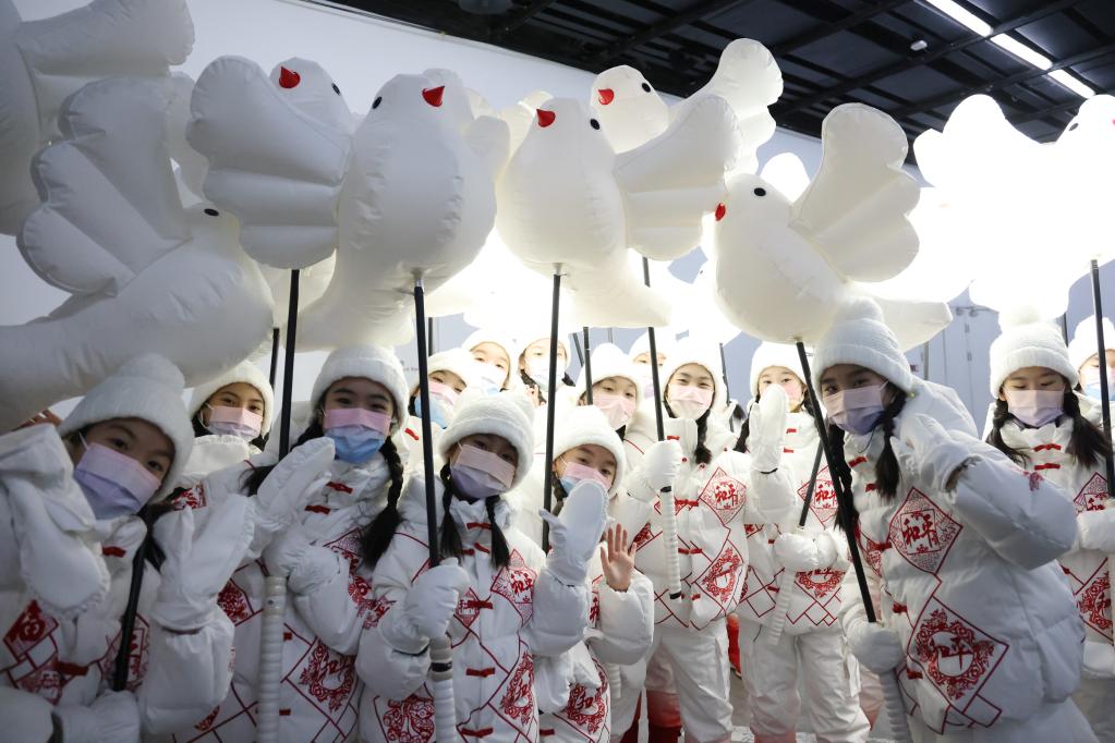1月27日,北京2022年冬奧會(huì)開幕式《雪花》幕后。圖為“小鴿子”們?cè)诓逝徘昂驁?chǎng)。新華社記者許雅楠攝