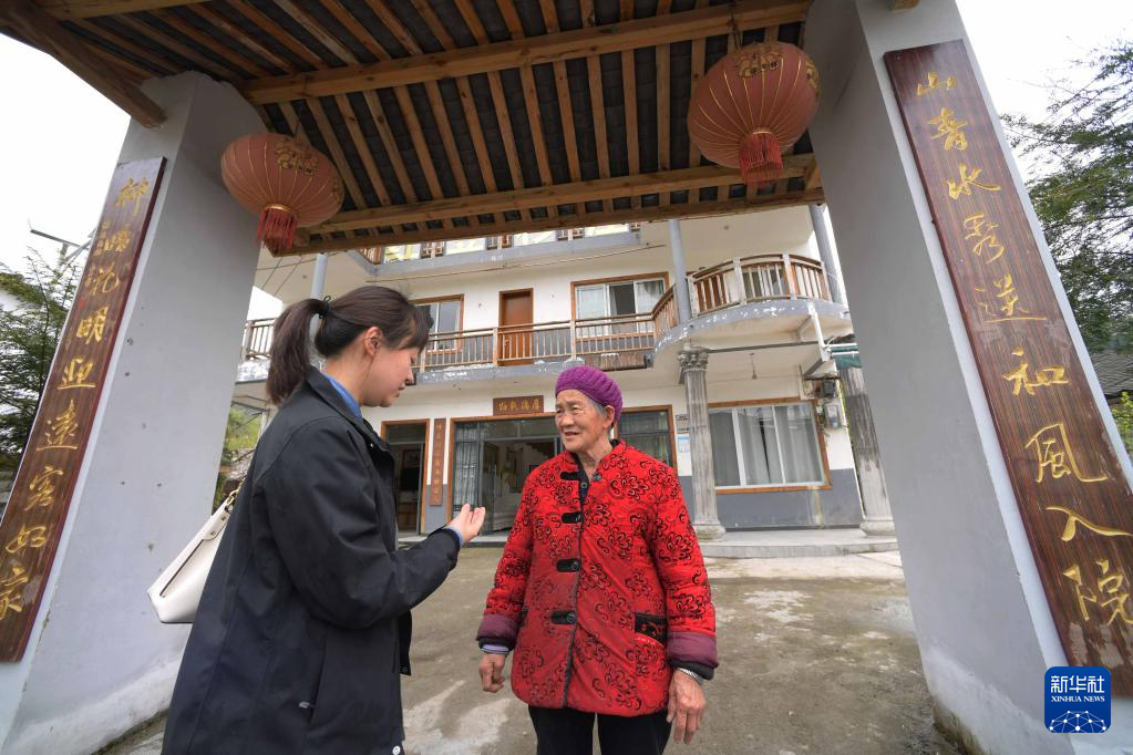 4月19日,游客和村民在桐梓縣九壩鎮(zhèn)山堡社區(qū)一家民宿前交流。