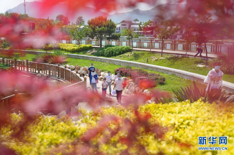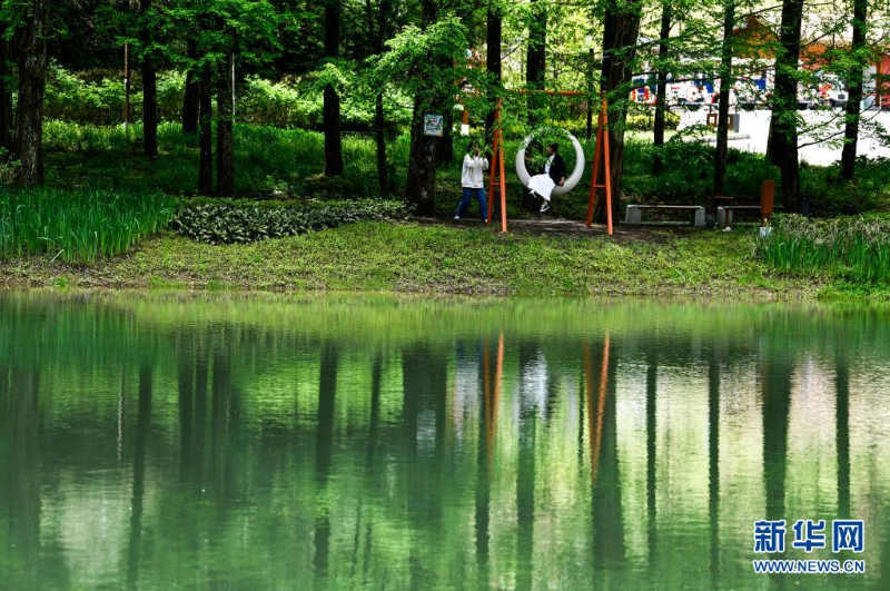 5月3日,游客在河北省石家莊市龍泉湖濕地公園內游覽。新華社記者 牟宇 攝