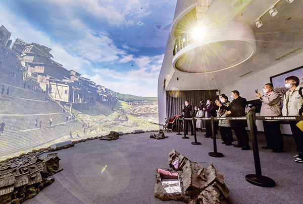 圖為在重慶紅巖革命紀念館“紅巖記憶”數(shù)字體驗廳內(nèi),觀眾們觀看以雙曲三維穹幕技術(shù)展示的場景。 新華社記者 李賀/攝