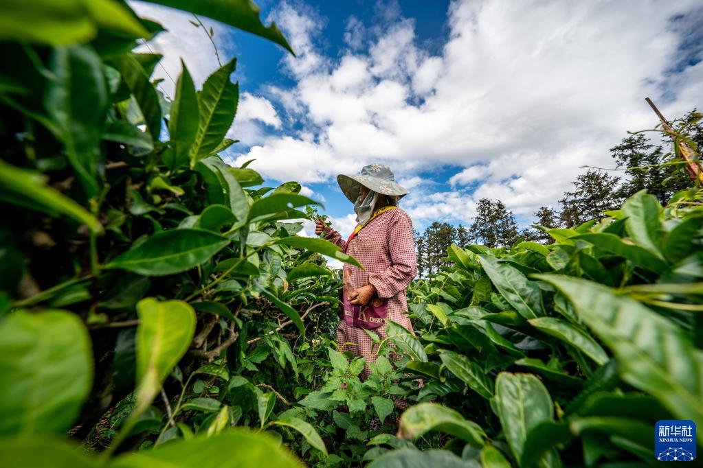 農(nóng)戶在普洱市思茅區(qū)南屏鎮(zhèn)整碗村的有機茶葉基地采茶(5月13日攝)。新華社記者江文耀攝