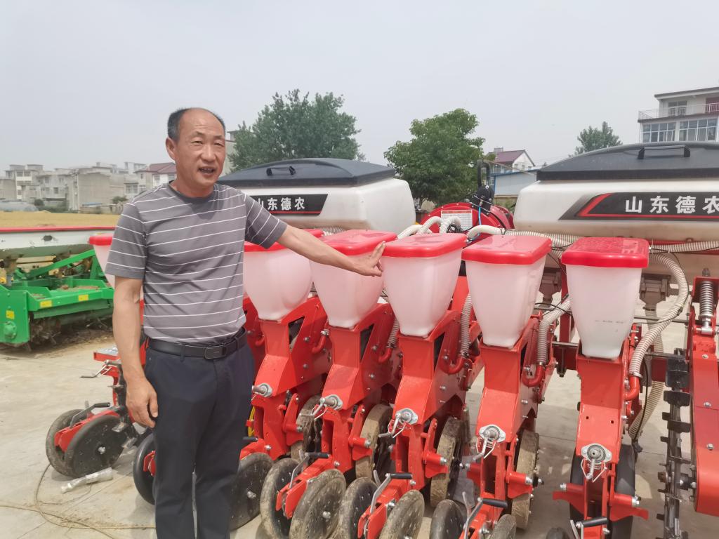 趙化向記者展示新購(gòu)置的大豆玉米復(fù)式播種機(jī)。新華社記者 水金辰 攝