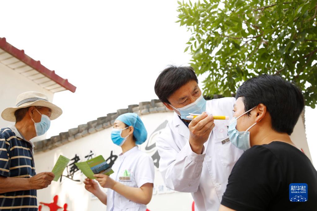 6月5日,河北省邢臺市南和區(qū)人民醫(yī)院醫(yī)務人員深入鄉(xiāng)村開展基層義診活動,為賈宋鎮(zhèn)蘇史張村村民檢查眼睛。新華社發(fā)(張馳 攝)