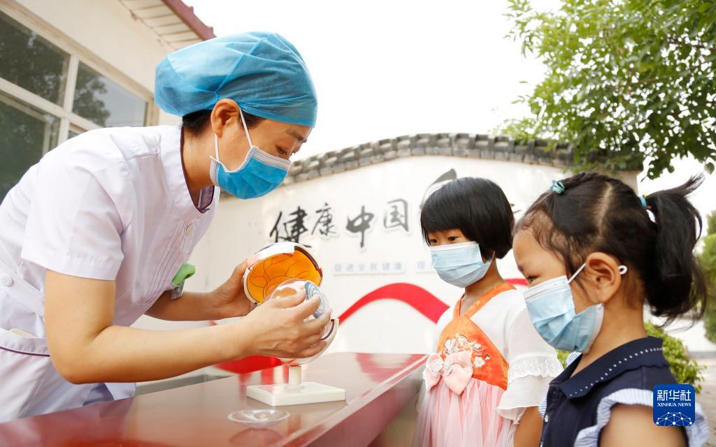 6月5日,河北省邢臺市南和區(qū)人民醫(yī)院醫(yī)務人員深入鄉(xiāng)村開展基層義診活動,為賈宋鎮(zhèn)蘇史張村小朋友講解眼睛的結(jié)構(gòu)和功能。新華社發(fā)(張馳 攝)