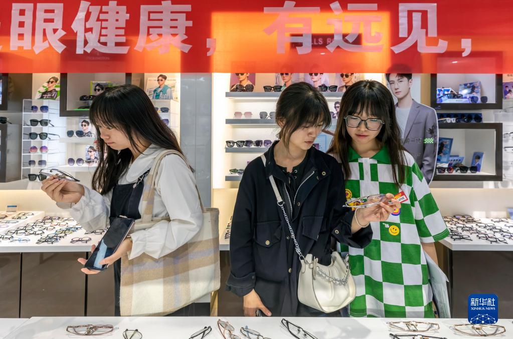 6月5日,學生在貴州省黔西市一家眼鏡店內(nèi)選配眼鏡。新華社發(fā)(范暉 攝)