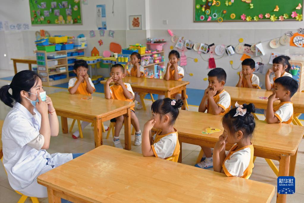 6月5日,在山東省煙臺市福山區(qū)一家幼兒園,醫(yī)務人員指導小朋友做眼保健操。新華社發(fā)(孫文潭 攝)