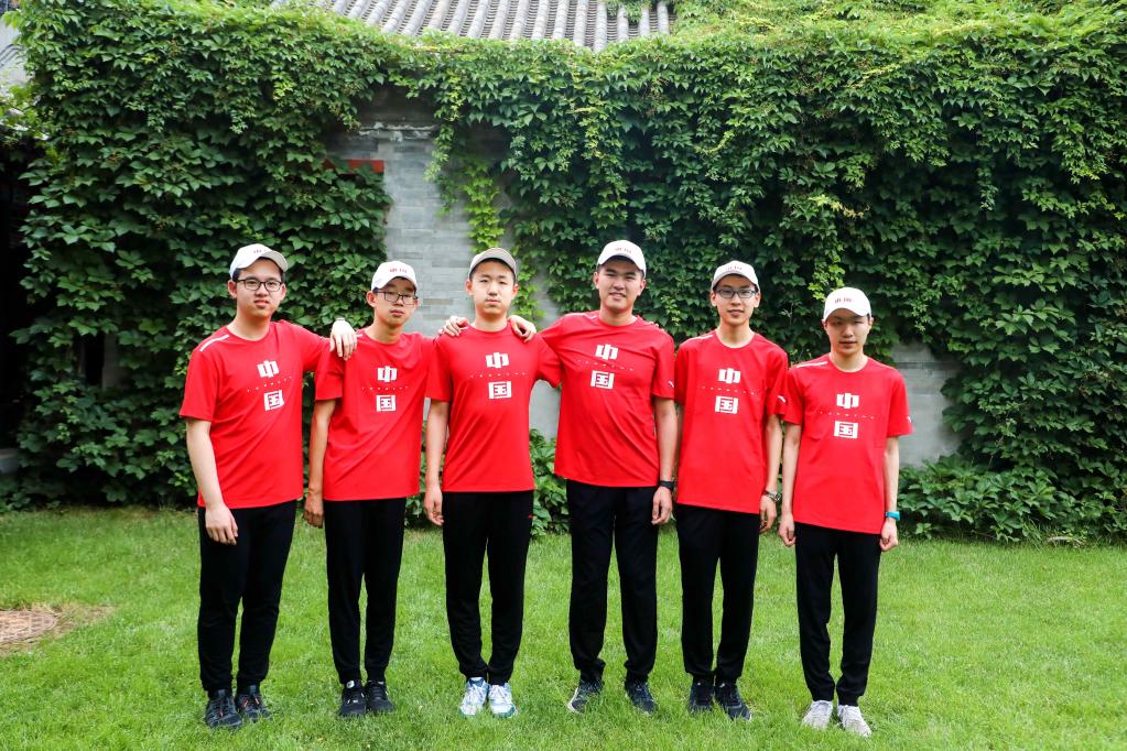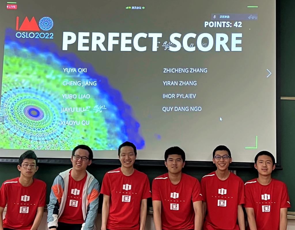 圖為中國數(shù)學(xué)奧林匹克國家隊6名隊員在成績屏前合影。