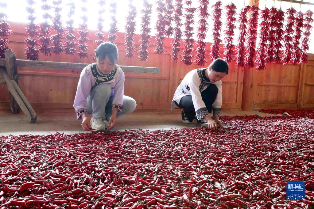 9月1日,在貴州省榕江縣平陽鄉(xiāng)硐里村,村民在晾曬朝天椒。新華社發(fā)(李長(zhǎng)華 攝)