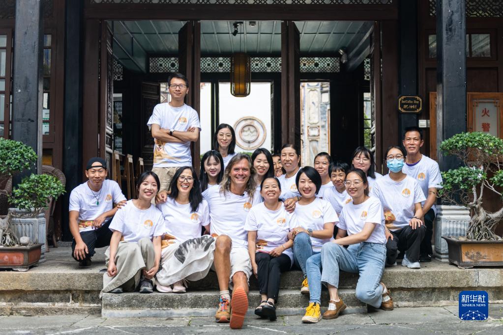 8月28日,林登和妻子瑾妮與喜林苑團隊在云南省喜洲古鎮(zhèn)喜林苑合影。新華社記者 曹夢瑤 攝