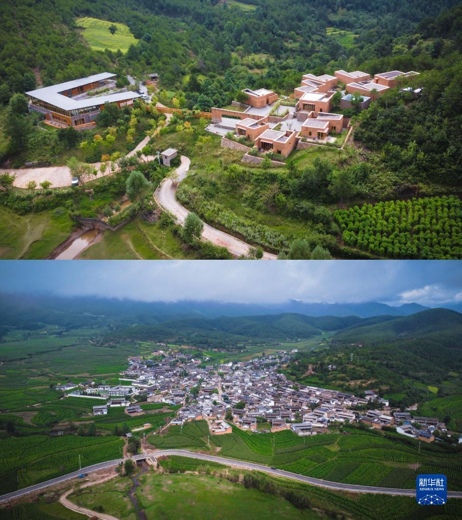 拼版照片:上圖為位于云南省沙溪鎮(zhèn)石龍村的喜林苑沙溪店(8月31日攝,無人機照片);下圖為喜林苑沙溪店所在的石龍村(8月31日攝,無人機照片)。新華社記者 曹夢瑤 攝