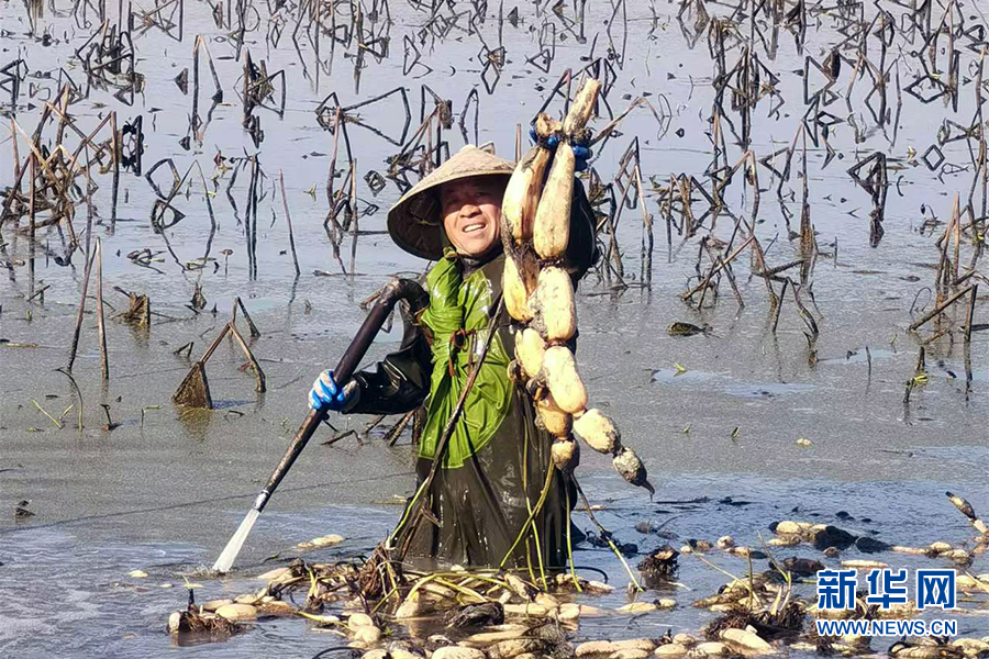 圖為藕農(nóng)在洪湖市雨錢(qián)蓮藕種植專業(yè)合作社的藕田搶抓農(nóng)時(shí)采挖蓮藕。新華網(wǎng)發(fā) 洪曉俊攝