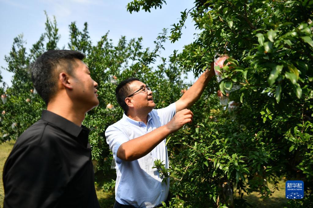 陜西省西安市臨潼區(qū)園藝工作站工作人員(右)與當(dāng)?shù)厥穹N植大戶交流果品長勢(2022年9月26日攝)。新華社記者 張博文 攝