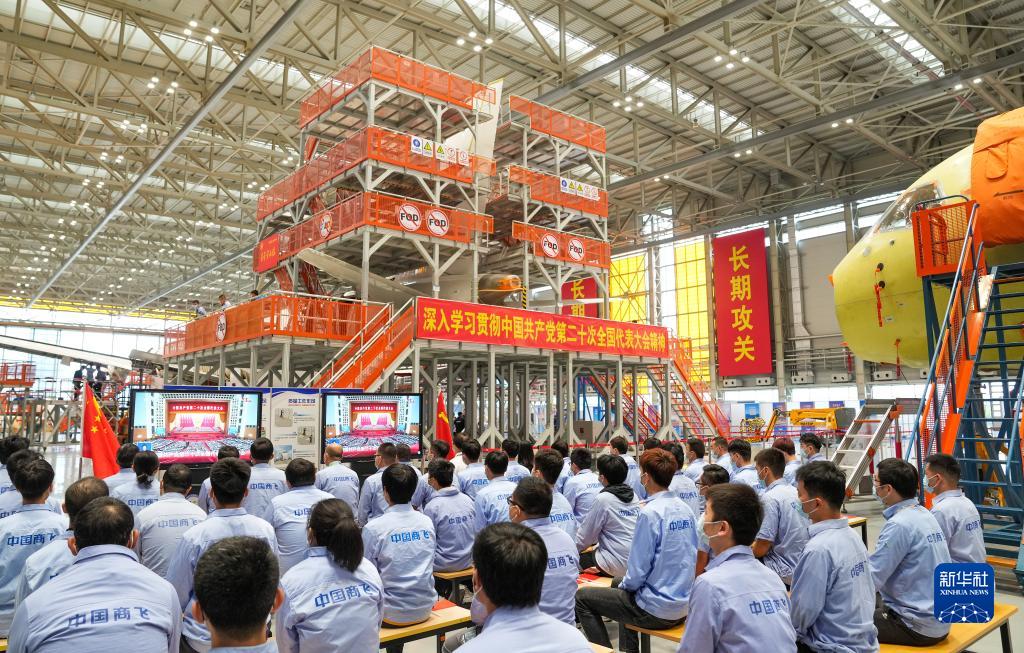 10月16日,在中國(guó)商飛上海飛機(jī)制造有限公司總裝車間,員工們?cè)谑湛粗袊?guó)共產(chǎn)黨第二十次全國(guó)代表大會(huì)開幕會(huì)。新華社記者 丁汀 攝