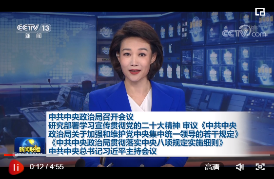 二十屆中共中央政治局10月25日召開會(huì)議,研究部署學(xué)習(xí)宣傳貫徹黨的二十大精神,審議《中共中央政治局關(guān)于加強(qiáng)和維護(hù)黨中央集中統(tǒng)一領(lǐng)導(dǎo)的若干規(guī)定》《中共中央政治局貫徹落實(shí)中央八項(xiàng)規(guī)定實(shí)施細(xì)則》。中共中央總書記習(xí)近平主持會(huì)議。