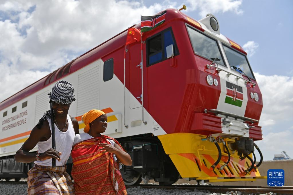 在肯尼亞蒙巴薩,當(dāng)?shù)孛癖娫谥袊兄频拿蓛?nèi)鐵路首批內(nèi)燃機車旁載歌載舞(2017年1月11日攝)。新華社記者 孫瑞博 攝
