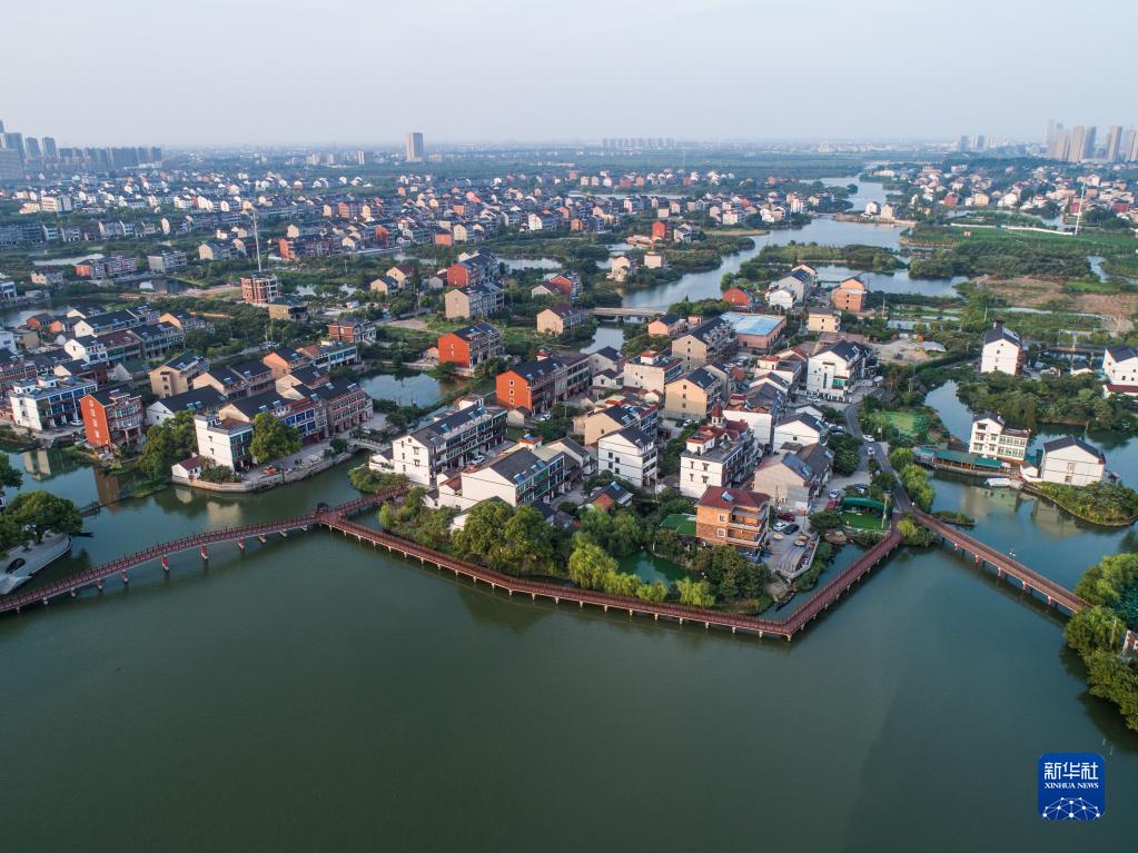 空中俯瞰杭州市余杭區(qū)塘棲古鎮(zhèn)丁山湖邊的水上棧道和丁河村(2019年8月7日攝,無人機照片)。新華社記者 徐昱 攝