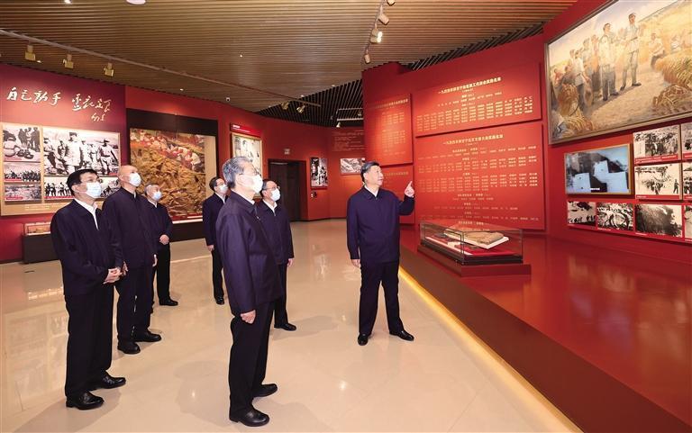 10月27日,中共中央總書記、國家主席、中央軍委主席習近平帶領中共中央政治局常委李強、趙樂際、王滬寧、蔡奇、丁薛祥、李希,瞻仰延安革命紀念地。這是習近平等在延安革命紀念館,參觀《偉大歷程——中共中央在延安十三年歷史陳列》。 新華社記者 鞠鵬攝