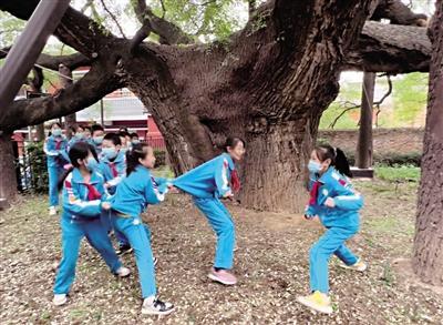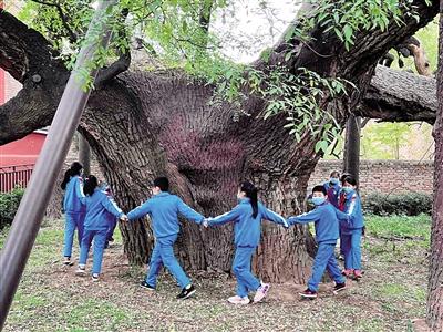 放學(xué)鈴聲響起,同學(xué)們排著隊(duì),有序從學(xué)校走出。“這棵古樹,到了夏天,伸展出的枝葉,可以覆蓋大部分校園,同學(xué)們在大樹的懷抱下,避開烈日,享受課間自由活動時(shí)間。”李以萱說著,召喚12名同學(xué),大家手拉手環(huán)繞在“護(hù)王槐”主干周圍,玩起了老鷹捉小雞,唱著《上學(xué)歌》。