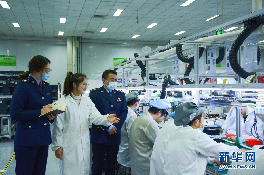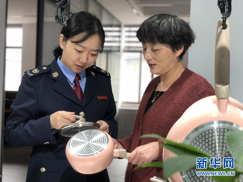 稅務(wù)人員與寧波喜爾美廚房用品有限公司工作人員交流。新華網(wǎng)發(fā)
