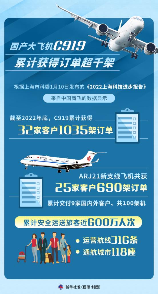根據(jù)上海市科委1月10日發(fā)布的《2022上??萍歼M(jìn)步報(bào)告》,來(lái)自中國(guó)商飛的數(shù)據(jù)顯示,2022年12月,C919大型客機(jī)首架機(jī)交付首家用戶東方航空公司,邁出市場(chǎng)運(yùn)營(yíng)“第一步”。截至2022年底,C919累計(jì)獲得32家客戶1035架訂單。