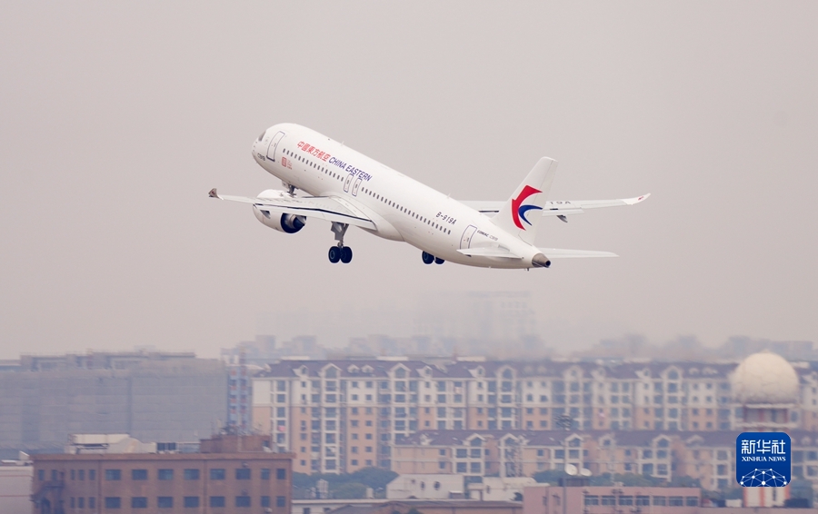 2022年12月26日,國(guó)產(chǎn)大飛機(jī)C919在上海虹橋國(guó)際機(jī)場(chǎng)起飛。 當(dāng)日,國(guó)產(chǎn)大飛機(jī)C919交付東航的全球首架機(jī)的首班驗(yàn)證飛行開啟,從上海虹橋國(guó)際機(jī)場(chǎng)飛往北京首都國(guó)際機(jī)場(chǎng)。 新華社發(fā)