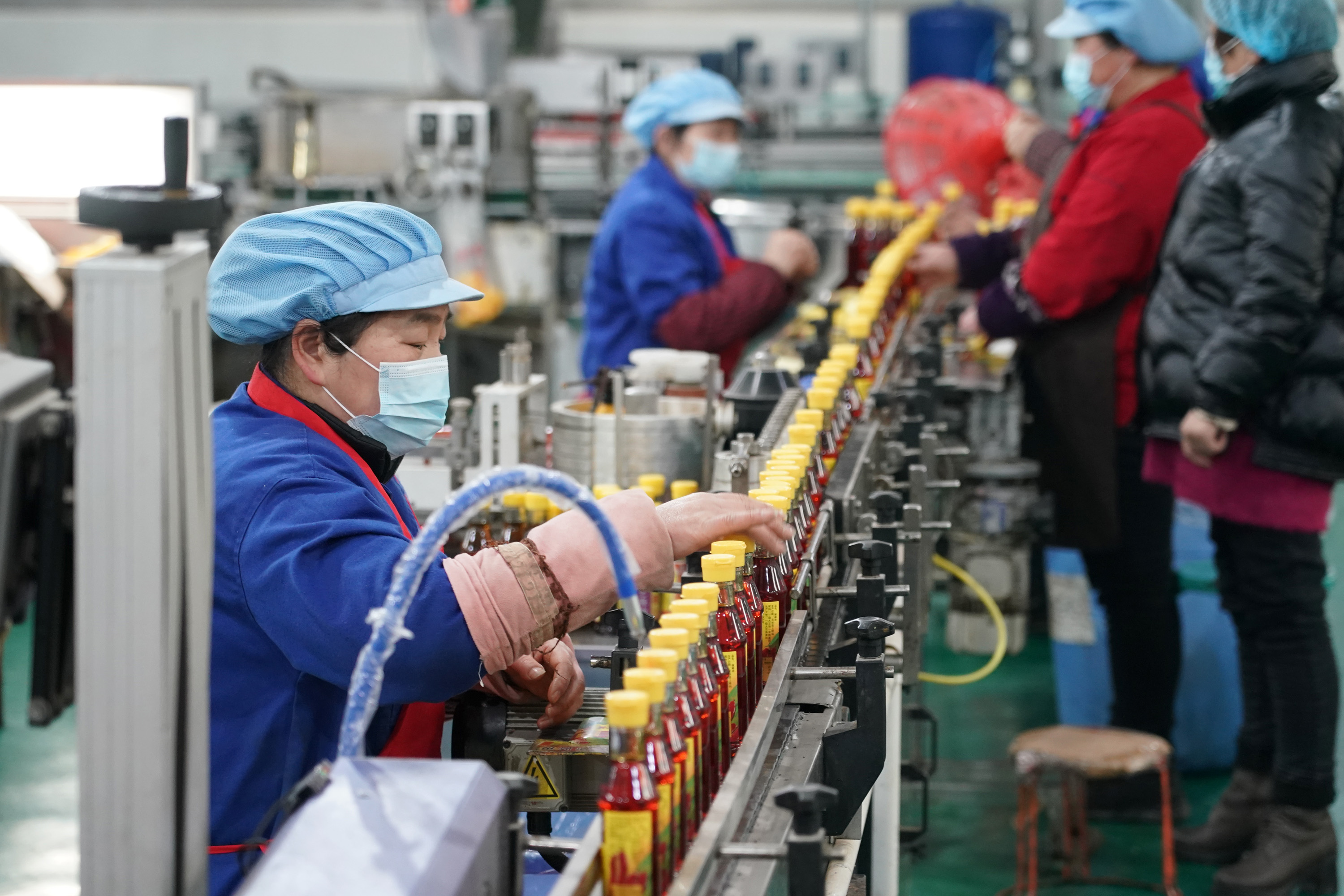2月10日,陜西省三原縣西陽鎮(zhèn)一家香油企業(yè)的工人在車間包裝線上工作。 新華社記者 邵瑞 攝