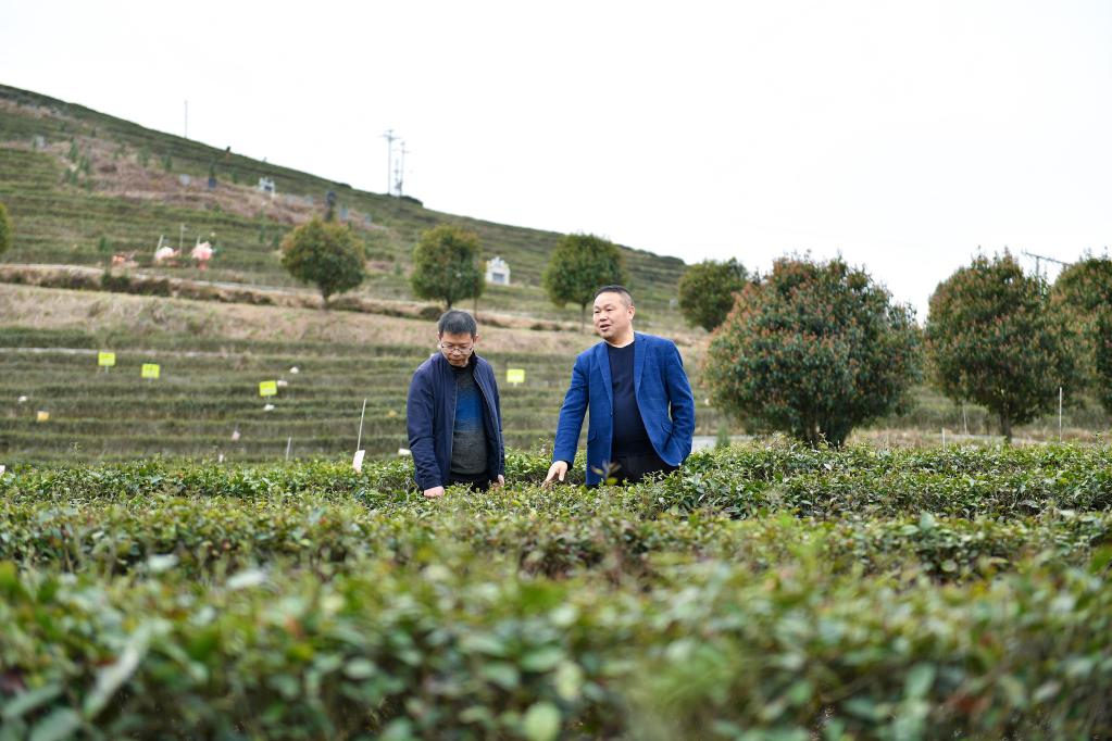 羅新亮(右)在茶園查看茶葉長(zhǎng)勢(shì)。新華社記者陳振海 攝