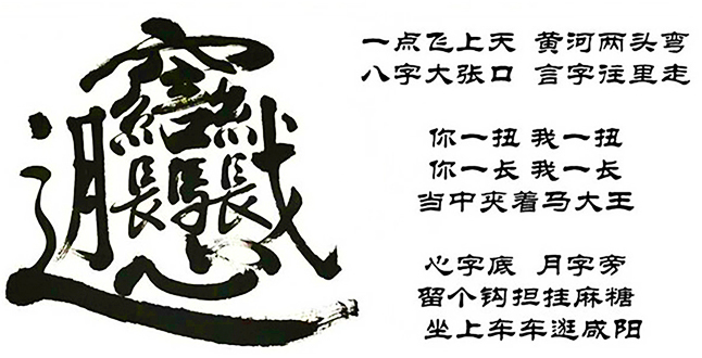 可“biang”字怎么寫?秀才拿出筆墨,寫出了以下口訣:一點(diǎn)飛上天,黃河兩邊彎;八字大張口,言字往里走,左一扭,右一扭;西一長,東一長,中間加個馬大王;心字底,月字旁,留個勾搭掛麻糖;推個車車逛咸陽。于是就有了今天的“biang”字。