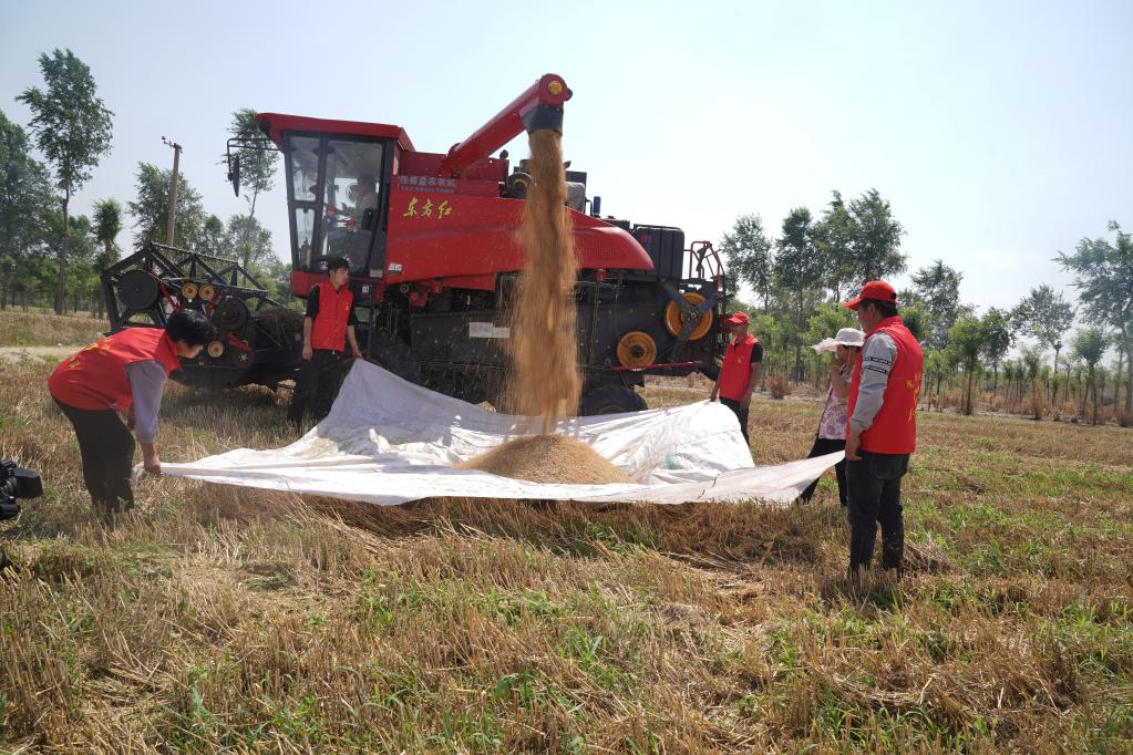 在河北邢臺經(jīng)濟(jì)開發(fā)區(qū)的一處麥田,志愿者正在幫助農(nóng)民收小麥。新華社記者 鄒尚伯 攝