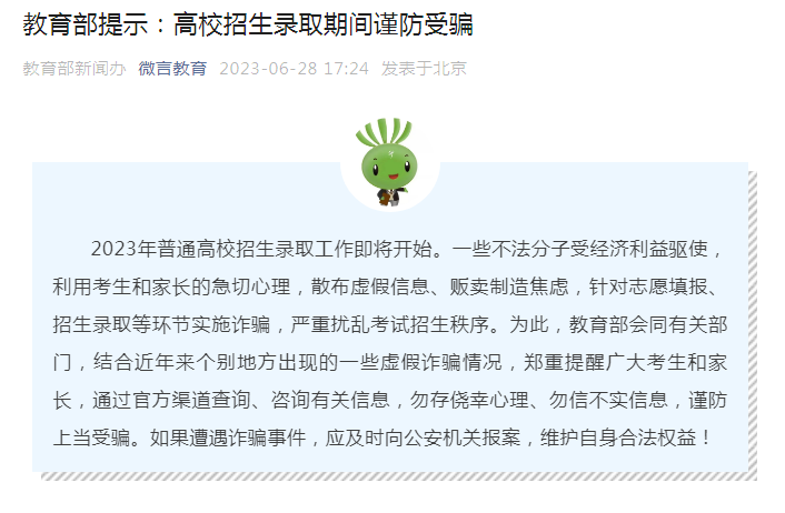 2023年普通高校招生錄取工作即將開始。教育部會同有關(guān)部門,結(jié)合近年來個別地方出現(xiàn)的一些虛假詐騙情況,鄭重提醒廣大考生和家長,通過官方渠道查詢、咨詢有關(guān)信息,勿存僥幸心理、勿信不實信息,謹(jǐn)防上當(dāng)受騙。