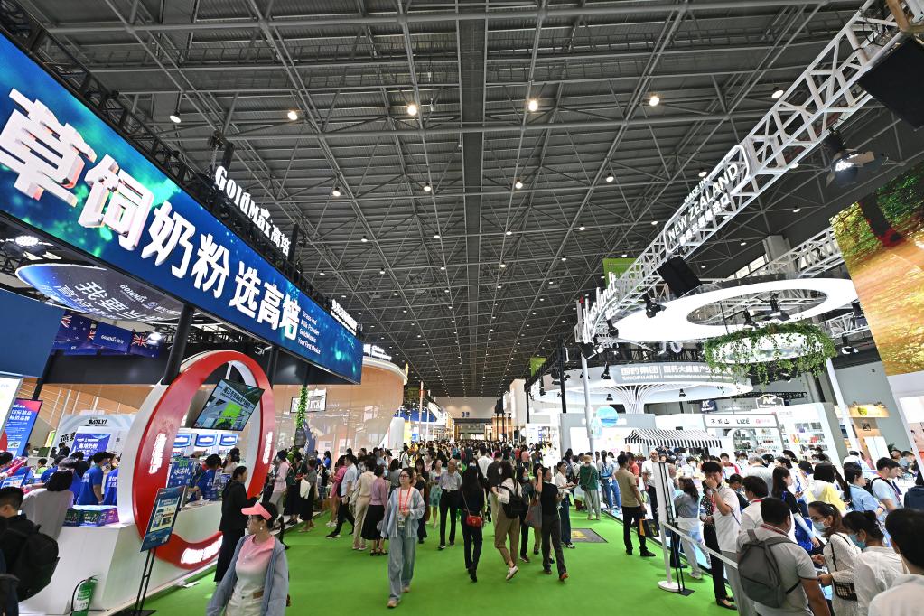 這是第三屆消博會(huì)上新西蘭兩大奶粉品牌高培(左)和荷仕蘭的展臺(tái)(2023年4月12日攝)。新華社記者李鑫攝