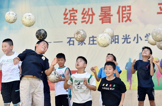 暑假期間,為減輕家長負(fù)擔(dān),有效緩解學(xué)生暑期“看護(hù)難”問題,部分學(xué)校、社區(qū)開展暑期免費(fèi)托管,為學(xué)生提供作業(yè)輔導(dǎo)和素質(zhì)課程等服務(wù),讓孩子們度過一個(gè)快樂、有意義的假期。 圖為7月10日,在石家莊市陽光小學(xué),學(xué)生進(jìn)行足球訓(xùn)練。張曉峰/攝(新華社發(fā))