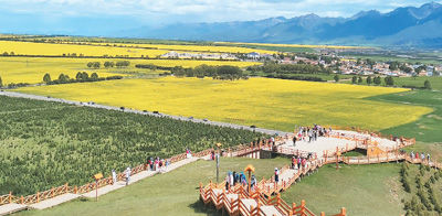 7月,青海省門源回族自治縣油菜花綻放,一蓬蓬、一簇簇迎風(fēng)舞動,宛如金色的海洋。付利攝 |