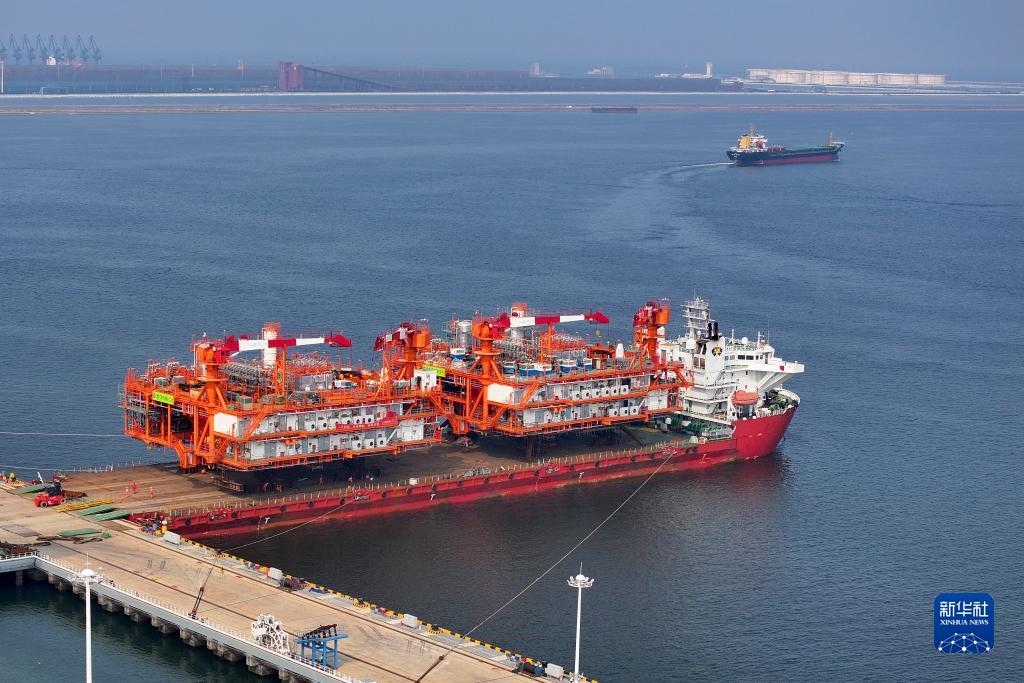 這是8月9日在天津濱海新區(qū)拍攝的渤中19-6凝析氣田I期開發(fā)項目組塊裝船作業(yè)現場(無人機照片)。組塊裝船后將赴渤海西部海域,進入海上安裝和聯調階段。新華社發(fā)(杜鵬輝攝)